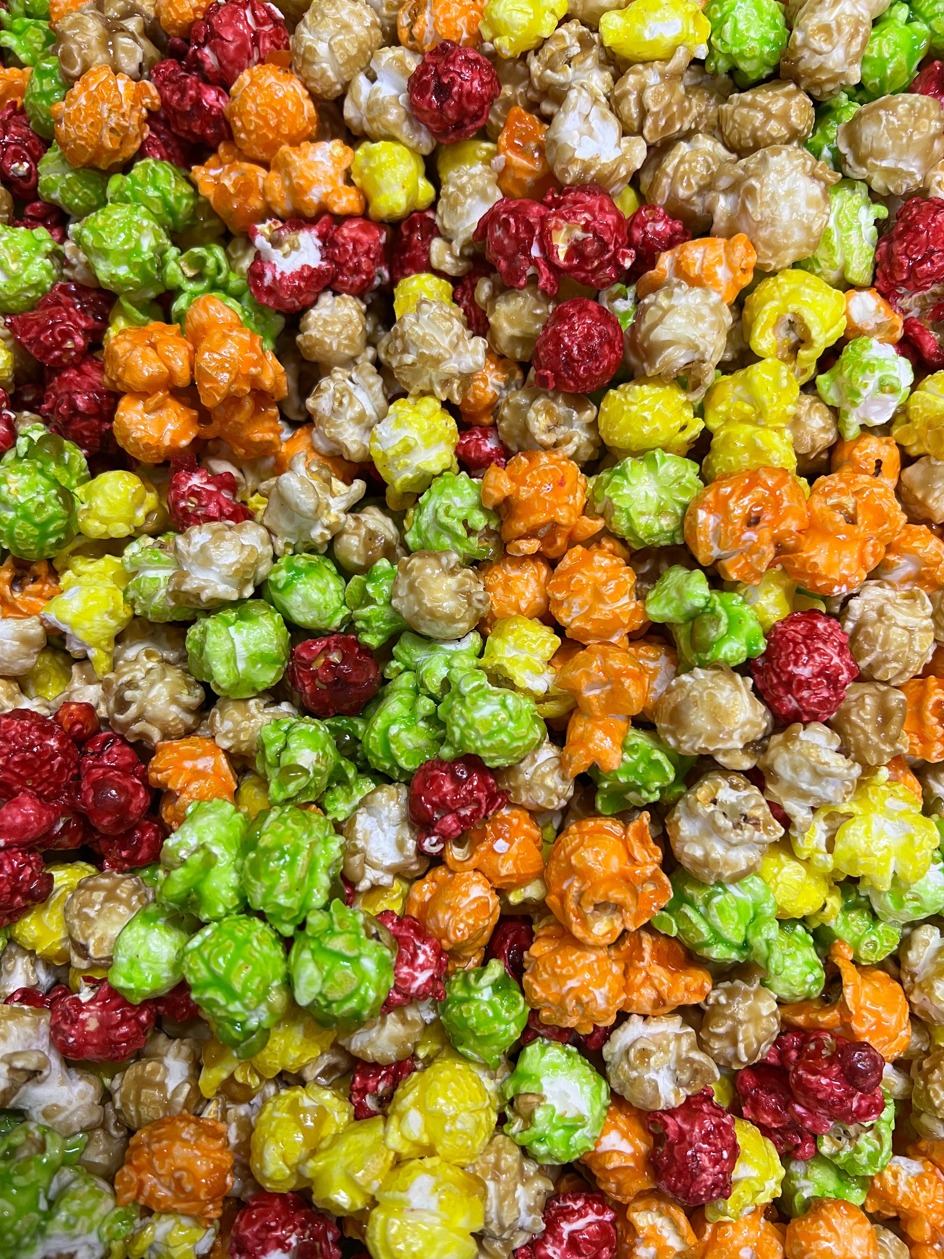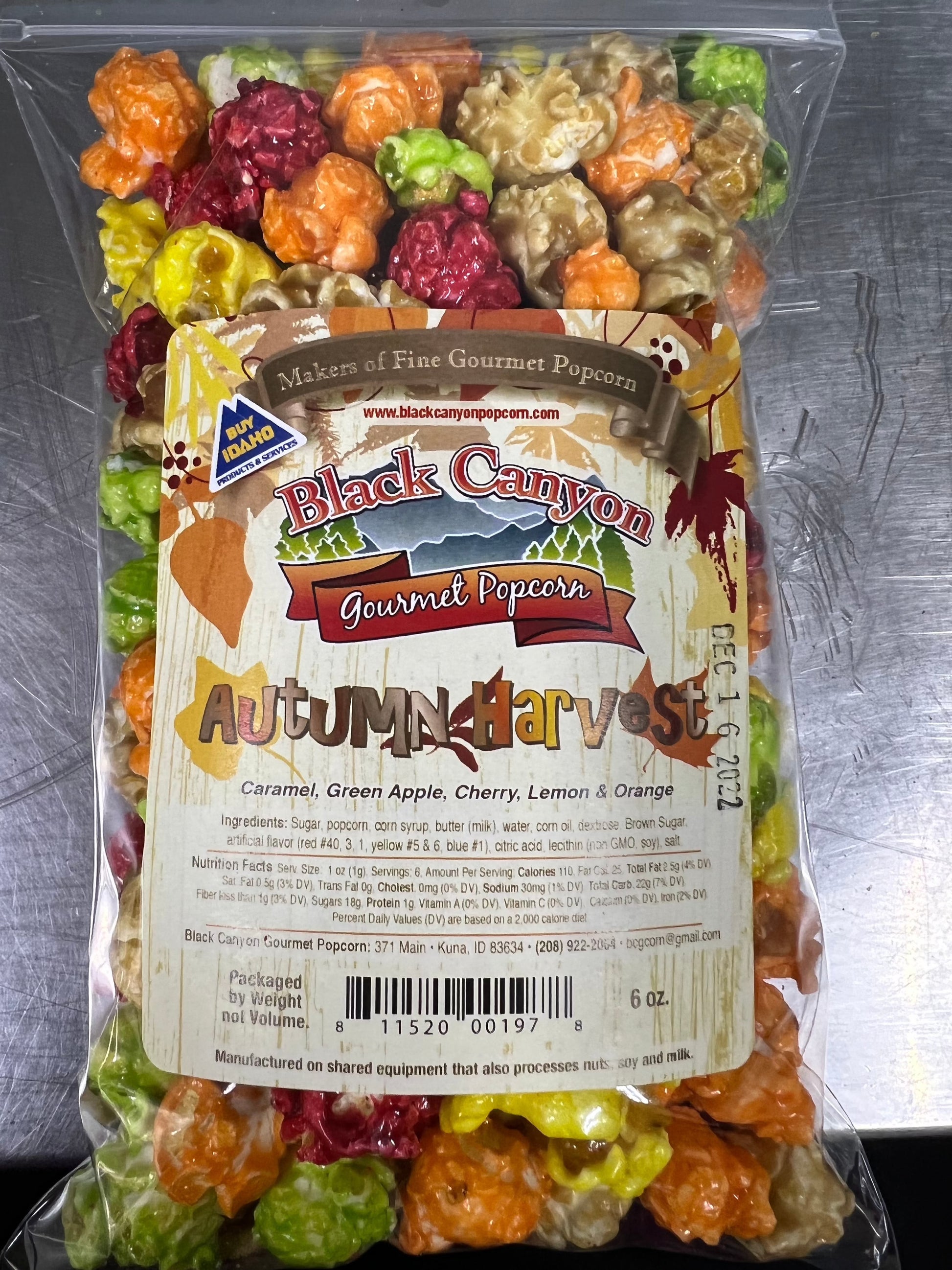 Blend of Caramel, Lemon, Cherry, Apple and Orange Popcorn. Beautiful array of fall colors and taste.